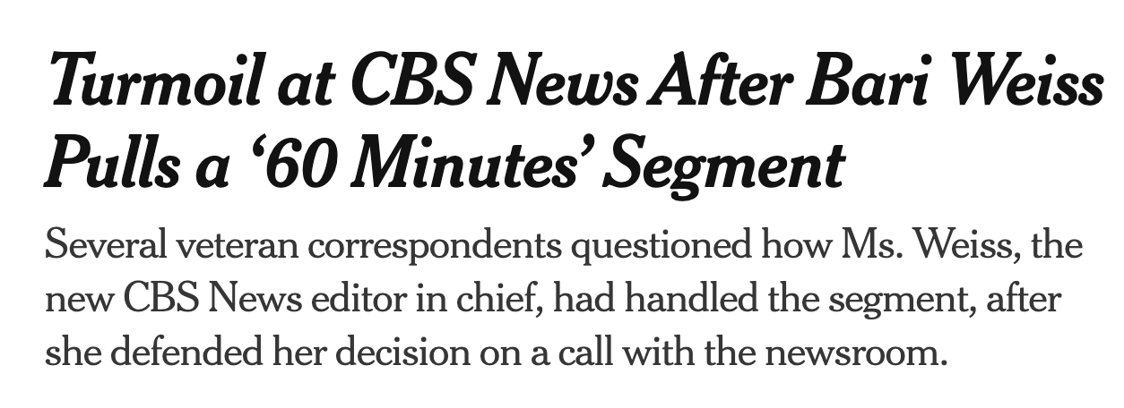 CBS’s new Editor In Chief Bari Weiss was hired by new owner David Ellison to make CBS’s news sensibility more… centrist. And to transform the product and organization so it is no longer dependent on linear TV (which is dying).